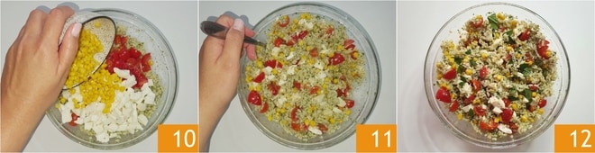 Fügen Sie die Kirschtomaten, den Mozzarella und den abgetropften Mais hinzu 10. Mischen Sie alles gut durch 11, dann schmecken Sie es mit Salz ab und verfeinern Sie es mit ein paar Basilikumblättern. Ihr vegetarischer Reissalat ist servierfertig 12!