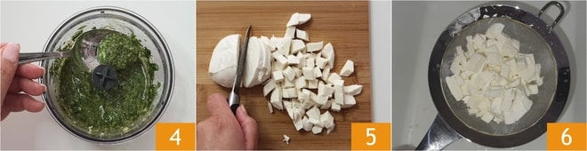 Mixen Sie es intermittierend, bis Sie eine cremige Konsistenz erreichen 4, dann füllen Sie das Pesto in ein Glas und stellen es bis zur Verwendung in den Kühlschrank. Bereiten Sie auch die anderen Zutaten vor: Schneiden Sie den Mozzarella in Würfel 5 und lassen Sie ihn in einem Sieb abtropfen, damit überschüssige Flüssigkeit verloren geht 6.