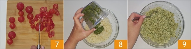 Waschen Sie die Kirschtomaten und vierteln Sie sie 7. Geben Sie nun den Reis in eine Schüssel, fügen Sie das Pesto hinzu 8 und vermischen Sie alles gut 9.