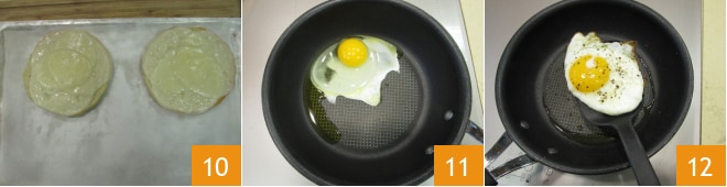 Nur so lange, bis der Käse geschmolzen ist. Wenn Sie möchten, können Sie auch die anderen beiden oberen Hälften der Sandwiches erwärmen 10. In der Zwischenzeit haben Sie Zeit, die Spiegeleier zu kochen. In einer heißen Pfanne mit etwas Öl schlagen Sie die Eier auf, wenn Sie möchten, können Sie einen kleinen Teller oder eine kleine Schüssel verwenden, um die Eier einzeln in die Pfanne gleiten zu lassen 11. Würzen Sie mit Salz und Pfeffer und wenn sie die gewünschte Konsistenz erreicht haben, wir empfehlen sie mit flüssigem Eigelb, können Sie die Sandwiches füllen 12.