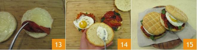 Auf die beiden Hälften mit dem geschmolzenen Käse, die Sie aus dem Ofen geholt haben, legen Sie zuerst die Paprikas 13, dann die Spiegeleier und streichen die saure Sahne auf die anderen beiden Hälften (die obere Hälfte der Sandwiches, um genau zu sein) 14. Schließlich schließen Sie die Sandwiches und genießen sofort Ihre Sandwiches mit gerösteten Paprikas und Eiern 15.