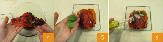 Sobald sie abgekühlt sind, lassen sie sich leichter schälen und die Samen und Innenfilamente entfernen 4. Schneiden Sie sie in Streifen, geben Sie sie in eine Schüssel und würzen Sie mit Knoblauch, einigen Minzblättern 5, Salz, Pfeffer und Öl. Mischen Sie alles gut und stellen Sie sie beiseite 6.
