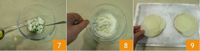 In der Zwischenzeit bereiten Sie die Soße zu. In einer Schüssel geben Sie die saure Sahne, schneiden mit einer Schere den Schnittlauch klein und würzen mit Salz, Pfeffer und Öl 7. Mischen Sie alles gut und stellen Sie auch diese beiseite 8. Nun legen Sie die beiden unteren Hälften des Sandwiches auf ein Backblech mit Backpapier, fügen die Käsescheiben hinzu und stellen sie für einige Minuten in den heißen Ofen 9.