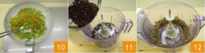 Sobald das Gemüse gar ist, entfernt ihr die Knoblauchzehe 10 und lasst das Gemüse etwas abkühlen. Zu diesem Zeitpunkt sind die Kichererbsen kalt; gebt sie in den Mixbecher 11 und püriert sie, bis sie zu Pulver/feiner Paste geworden sind 12.