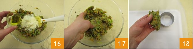 Dann fügt ihr 10 g Öl hinzu 16, rührt zuerst mit einem Spatel und knetet die Masse dann mit den Händen 17, bis ein kompakter Teig entstanden ist 17. Nehmt etwa 1/4 der Masse (ca. 100 g) und setzt sie in einen Ausstechring mit 7,5 cm Durchmesser 18.