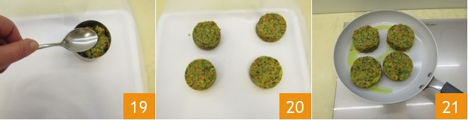 Drückt die Masse mit dem Rücken eines Löffels fest 19, damit sie kompakt wird. Wiederholt den Vorgang, bis alle 4 vegetarischen Burger geformt sind. Jetzt erhitzt ihr eine Pfanne, gebt das restliche Öl hinein und verwendet sie zum Braten der Burger. Sobald sie in der Pfanne liegen 21, wartet ihr etwa 2–3 Minuten, bis sich eine goldbraune Kruste bildet.