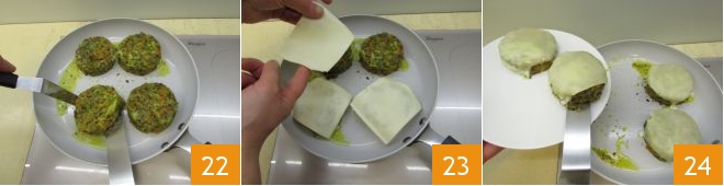 Erst jetzt könnt ihr sie wenden, am besten mit zwei Pfannenwendern 22, und die andere Seite ebenfalls etwa 2 Minuten fertigbraten. Sobald ihr sie gewendet habt, legt auf jeden Burger eine Scheibe Käse 23, so dass der Käse schön schmilzt. Nach dem Garen legt ihr die Burger auf einen Teller 24.