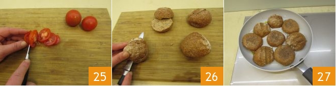 Schneidet die Tomaten in Scheiben 25, teilt dann die Brötchen in der Mitte 26 und erwärmt sie kurz in der Pfanne, gerade so lange, dass sie knuspriger werden, mit der Schnittfläche nach unten 27.