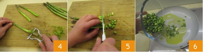 In der Zwischenzeit kümmert ihr euch um die Spargelstangen. Schneidet zuerst das holzige Ende ab, dann schält ihr sie 4 und schneidet sie in Scheiben 5; die Schalen könnt ihr für eine mineralstoffreiche Gemüsebrühe verwenden. Gebt in eine Pfanne etwa 20 g Öl, fügt eine Knoblauchzehe hinzu und lasst sie anschwitzen. Dann gebt ihr die Spargelstücke dazu 6, reduziert die Hitze und lasst sie bei geringer Temperatur 5–6 Minuten garen.