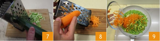 Reibt in der Zwischenzeit sowohl die Zucchini 7 als auch die zuvor geschälte und abgetrimmte Karotte 8 mit einer Reibe mit großen Löchern. Nach den 6 Minuten Garzeit der Spargelstücke gebt ihr auch Karotten und Zucchini in die Pfanne 9. Salzt, pfeffert und lasst alles weitere 7–8 Minuten köcheln, bis das Gemüse sehr weich ist.