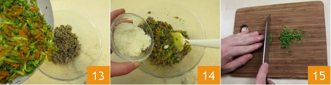 Gebt die Kichererbsenpüree dann in eine Schüssel, fügt das noch lauwarme Gemüse, den geriebenen Grana Padano 14 und den fein gehackten Schnittlauch hinzu 15.