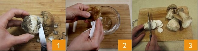 Um die Cremesuppe mit Steinpilzen zuzubereiten, beginnen Sie mit der Zubereitung der Gemüsebrühe. In der Zwischenzeit widmen Sie sich der Wie man Steinpilze putzt: Helfen Sie sich mit einem kleinen Messer und schaben Sie die Erde vom Pilz 1. Wenn viel Erde vorhanden ist, könnten Sie die Pilze kurz unter einem kalten Wasserstrahl abspülen (es ist vorzuziehen, diese Maßnahme zu vermeiden, um zu verhindern, dass sie Wasser aufnehmen) 2. Wenn die Pilze wenig Erde haben, entfernen Sie sie vorsichtig mit einem Pinsel. Dann trennen Sie den Stiel sehr vorsichtig mit einer Drehbewegung vom Hut des Pilzes und schneiden beide der Länge nach in dünne Scheiben 3. Sobald sie fertig sind, legen Sie sie beiseite.