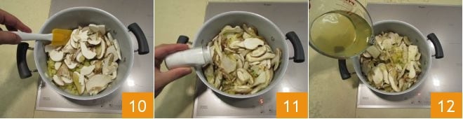 Erhitzen Sie auf moderater Hitze etwa 1 Minute lang, indem Sie die Zutaten umrühren, damit sie nicht am Boden kleben 10. Dann mit Salz 11 und Pfeffer abschmecken. Fügen Sie schließlich die Gemüsebrühe hinzu 12: Lassen Sie die Zutaten etwa 20 Minuten bei mittlerer Hitze so kochen.