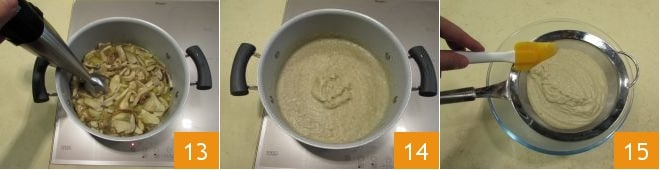 Wenn die Brühe aufgesogen ist, pürieren Sie die Zutaten mit einem Stabmixer 13: Sie sollten eine homogene Mischung erhalten 14, die Sie in einer Schüssel sammeln und durch ein Sieb streichen können, um sie cremiger zu machen 15.