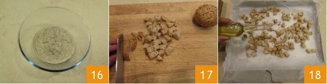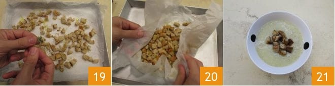 Würzen Sie mit Oregano-Blättchen 19 und um gleichmäßig zu würzen, können Sie die Ränder des Backpapiers leicht anheben, um die Croutons darin zu mischen 20. Um die Croutons knusprig zu machen, backen Sie sie in einem auf Grillmodus vorgeheizten statischen Ofen bei 240°C etwa 3 Minuten lang. Nach dem Backen herausnehmen und auf Ihre angerichtete Cremesuppe mit Steinpilzen legen (wenn Sie möchten, auch mit einigen in der Pfanne erhitzten Scheiben Steinpilzen). Sie können mit einem Schuss Öl garnieren und noch heiß genießen 21!