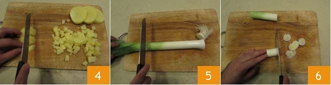 Fahren Sie damit fort, das Gemüse zu waschen und zu trocknen. Nehmen Sie die Kartoffeln und schälen Sie sie, dann schneiden Sie sie in Würfel 4 und legen Sie sie beiseite. Entfernen Sie den Schopf und den grünen Teil des Lauchs 5, und schneiden Sie ihn dann in sehr dünne Ringe 6.