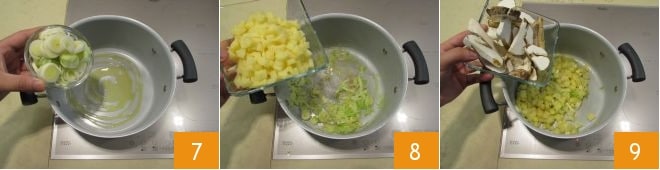 Braten Sie den Lauch in einer antihaftbeschichteten Pfanne mit einem Schuss Öl an 7. Wenn er weich geworden ist, geben Sie die Kartoffeln 8 und die Steinpilze 9 hinzu. Wenn Sie möchten, können Sie einige Scheiben für die endgültige Dekoration beiseite lassen (wenn Sie dies tun, braten Sie sie in einer mit einem Schuss Öl beträufelten Pfanne 1 Minute pro Seite an).
