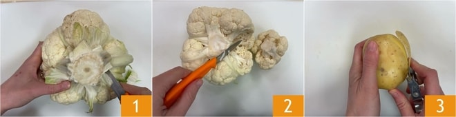 Um die Blumenkohl- und Kurkuma-Cremesuppe zuzubereiten, reinigen Sie zunächst den Blumenkohl, indem Sie den Stiel und die Blätter entfernen 1; dann in Röschen teilen 2. Schälen Sie die Kartoffeln 3.