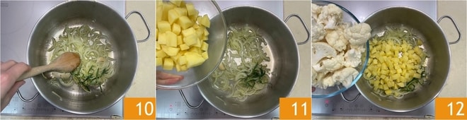 Braten Sie alles an, bis die Zwiebel weich ist; fügen Sie dann die Kartoffeln 11 und den Blumenkohl 12 hinzu.