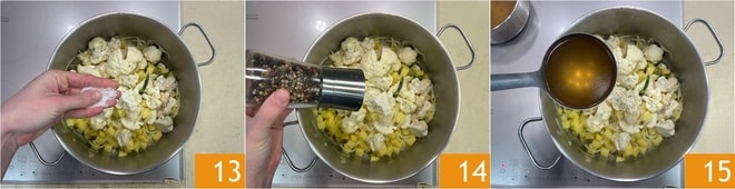 Würzen Sie mit Salz 13 und Pfeffer 14; gut ummischen und 5 Minuten kochen. Dann fügen Sie die Gemüsebrühe hinzu, bis alles bedeckt ist 15. Bringen Sie alles zum Kochen, dann reduzieren Sie die Hitze und lassen Sie es mit einem Deckel für ca. 20-25 Minuten köcheln, oder bis das Gemüse weich ist.