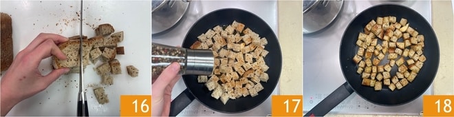 In der Zwischenzeit schneiden Sie die Brotscheiben in Würfel 16. Geben Sie sie in eine Pfanne, fügen Sie etwas Öl, eine Prise Salz und Pfeffer 17 hinzu. Auch etwas Paprika dazugeben. Lassen Sie es in der Pfanne anrösten.