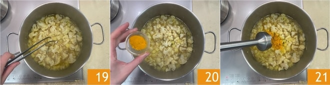 Wenn das Gemüse gekocht ist, entfernen Sie den Knoblauch und den Rosmarin 19. Fügen Sie das Kurkuma 20 hinzu und pürieren Sie alles mit einem Stabmixer 21.