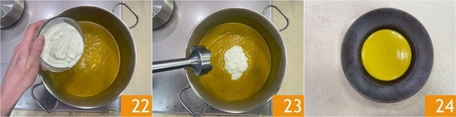 Wenn Sie eine glatte Creme erhalten haben, fügen Sie den Joghurt 22 hinzu und pürieren Sie erneut 23. Anrichten 24.