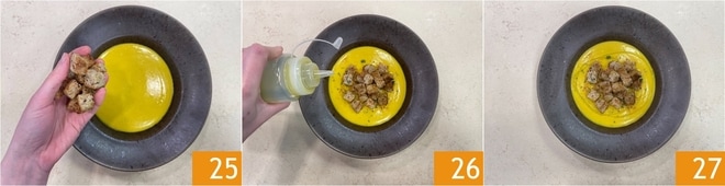 Beenden Sie mit den knusprigen Croûtons 25, einem Spritzer Öl 26, einer Prise Paprika und gehacktem Rosmarin 27.