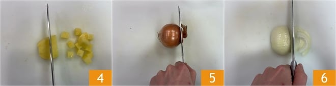 Schneiden Sie sie in Würfel 4 und widmen Sie sich der Zwiebel. Schälen Sie sie 5 und schneiden Sie sie in dünne Scheiben 6.