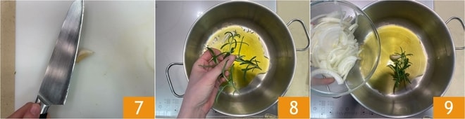 Drücken Sie die Knoblauchzehen mit der Messerklinge 7. In einem großen Topf erhitzen Sie etwas Olivenöl bei mittlerer Hitze. Fügen Sie den Knoblauch, den Rosmarin 8 und die Zwiebel 9 hinzu.