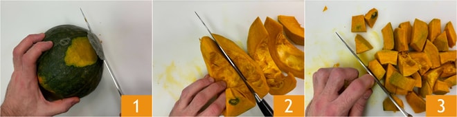 Um die Kürbiscremesuppe mit Ziegenkäse zuzubereiten, entfernen Sie zuerst die Schale des Kürbisses 1 und entfernen Sie die Samen und inneren Fasern. Schneiden Sie ihn zuerst in Scheiben 2 und dann in Würfel 3.