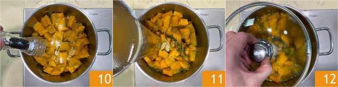 Mit Salz und Pfeffer abschmecken 10. Gießen Sie die Gemüsebrühe in den Topf 11, bringen Sie sie zum Kochen, dann die Hitze reduzieren, mit einem Deckel zudecken 12, und 20 Minuten oder bis der Kürbis weich ist, köcheln lassen.