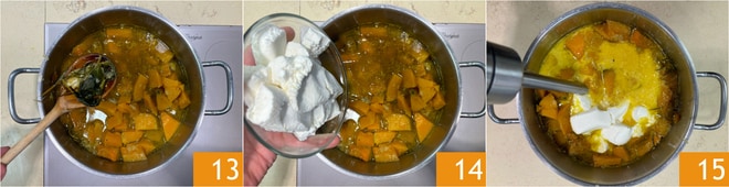 Schalten Sie die Hitze ab, entfernen Sie den Rosmarin, den Salbei und den Knoblauch 13 und fügen Sie 400 g Ziegenkäse hinzu 14. Pürieren Sie mit einem Stabmixer 15 bis eine glatte und homogene Cremesuppe entsteht.