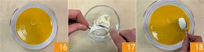 Richten Sie an 16. Für jeden Teller formen Sie mit zwei Teelöffeln 3 kleine Nocken mit dem Ziegenkäse 17 und platzieren Sie sie auf der Cremesuppe 18.