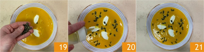 Vervollständigen Sie es mit gerösteten Kürbiskernen 19 und einem Schuss Öl 20. Ihre Kürbiscremesuppe mit Ziegenkäse ist bereit zum Servieren 21.