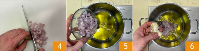 Schneiden Sie die Schalotte in dünne Scheiben 4. Erhitzen Sie in einem Topf das Öl, fügen Sie die Schalotte 5 und die zerdrückte Knoblauchzehe in der Schale 6 hinzu.