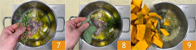 Fügen Sie den Rosmarin 7, den Salbei 8 hinzu und lassen Sie es 2 Minuten anbraten. Fügen Sie den Kürbis hinzu 9 und braten Sie ihn 5-7 Minuten bei hoher Hitze an, häufig rühren.