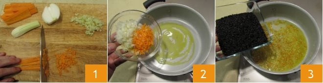 Um den schwarzen Reis mit Curry zuzubereiten, bereiten Sie einen Liter Gemüsebrühe zu, dann waschen, schälen und hacken Sie Sellerie, Karotte und Zwiebel für das Soffritto 1. Erhitzen Sie das Olivenöl in einem breiten Topf, fügen Sie das gehackte Gemüse für das Soffritto hinzu 2, lassen Sie es 5 Minuten anschwitzen und fügen Sie dann den schwarzen Reis hinzu 3.