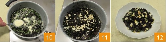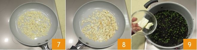 In der Zwischenzeit legen Sie die Mandeln in eine Pfanne 7 und rösten sie für ein paar Minuten 8. Schalten Sie die Hitze aus, wenn der Reis gar ist, und rühren Sie die Butter unter 9,