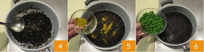 Rösten Sie den Reis einige Augenblicke und fügen Sie dann die heiße Gemüsebrühe, eine Kelle nach der anderen, hinzu 4, wobei Sie darauf warten, dass die Flüssigkeit absorbiert wird, bevor Sie mehr hinzufügen. Kochen Sie den Reis 10 Minuten, dann fügen Sie das Curry hinzu 5, übergießen Sie sofort mit Brühe und rühren Sie um, damit der Reis Geschmack annimmt, dann fügen Sie die Erbsen hinzu 6 und kochen Sie weitere 10-15 Minuten, indem Sie nach und nach Brühe hinzufügen, bis der Reis gar ist. Würzen Sie nach Geschmack mit Salz und Pfeffer, falls nötig.