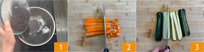 Um den Venusreis mit Gemüse zuzubereiten, kochen Sie zunächst den Reis in gesalzenem, kochendem Wasser gemäß der auf der Packung angegebenen Zeit 1. Schälen Sie in der Zwischenzeit die Karotten und schneiden Sie sie in etwa 1 cm große Würfel 2. Schneiden Sie die Zucchini zuerst in Stäbchen 3 und dann in Würfel derselben Größe.