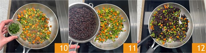 Am Ende der Kochzeit mit gehackter Petersilie würzen 10. Den Reis abgießen und in die Pfanne geben 11, dann umrühren, um die Zutaten zu mischen 12, und anrichten.