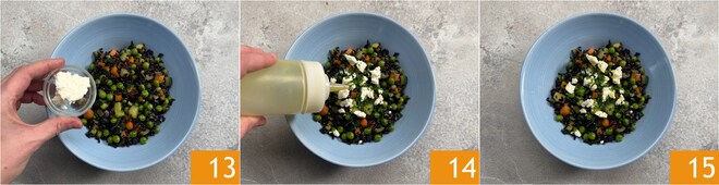 Mit zerbröseltem Feta 13, ein paar Petersilienblättern und einem Schuss Öl garnieren 14. Ihr Venusreis mit Gemüse ist bereit, genossen zu werden 15!