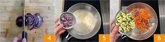 Putzen und schneiden Sie die Zwiebel dünn 4. Braten Sie die Zwiebel 2 Minuten lang in einer Pfanne mit einem Schuss Öl an 5, dann fügen Sie die Karotten und die Zucchini hinzu 6.