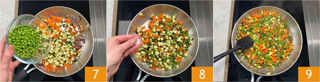 Fügen Sie die Erbsen hinzu 7, salzen Sie 8, mischen Sie und kochen Sie bei mittlerer bis hoher Hitze, häufig rührend, für 10 Minuten 9.