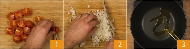 Um die Vermicelli nach Jägerart zuzubereiten, setzt zuerst einen Topf mit reichlich Wasser auf, das zum Kochen gesalzen werden soll, um die Pasta zu kochen. Wascht und halbiert die Kirschtomaten 1, dann schält die Zwiebel und hackt sie fein 2. Entfernt die Pelle von der Wurst und zerkrümelt sie grob. Erhitzt eine Pfanne mit einem Schuss Öl 3.