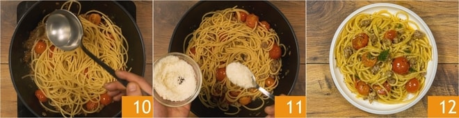 Vermischt alles gut, indem ihr eine Kelle des Kochwassers hinzufügt 10, dann nehmt die Pfanne vom Herd und rührt den geriebenen Pecorino unter 11. Serviert eure Vermicelli nach Jägerart mit frisch gemahlenem schwarzem Pfeffer nach Geschmack 12!