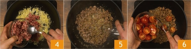 Schwitzt die Zwiebel 3-4 Minuten an, fügt dann die Wurst hinzu 4. Wenn die Wurst gut angebraten ist, löscht sie mit dem Weißwein ab 5 und lasst den Alkohol vollständig verdampfen. Gebt die Kirschtomaten dazu 6 und würzt mit Salz und Pfeffer.