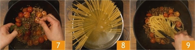 Gebt den Fenchel direkt in die Pfanne 7 und kocht das Ganze bei starker Hitze für ein paar Minuten. In der Zwischenzeit kocht die Vermicelli in dem Wasser, das mittlerweile kocht 8. Gießt die Pasta al dente ab und gebt sie in die Pfanne zur Sauce 9.