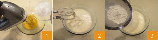 Um den verschneiten Weihnachtsbaumstamm vorzubereiten, beginnen Sie mit dem Biskuitteig. Geben Sie in eine Küchenmaschine die Eier bei Raumtemperatur, den Vanilleextrakt und schalten Sie die Rührbesen auf mittlere Geschwindigkeit ein; nach wenigen Augenblicken fügen Sie den Zucker in mehreren Portionen hinzu 1. Lassen Sie die Mischung 10/15 Minuten aufschlagen. Sobald die Masse „schreibt“ 2, schalten Sie die Rührbesen aus und sieben Sie das Mehl 3,